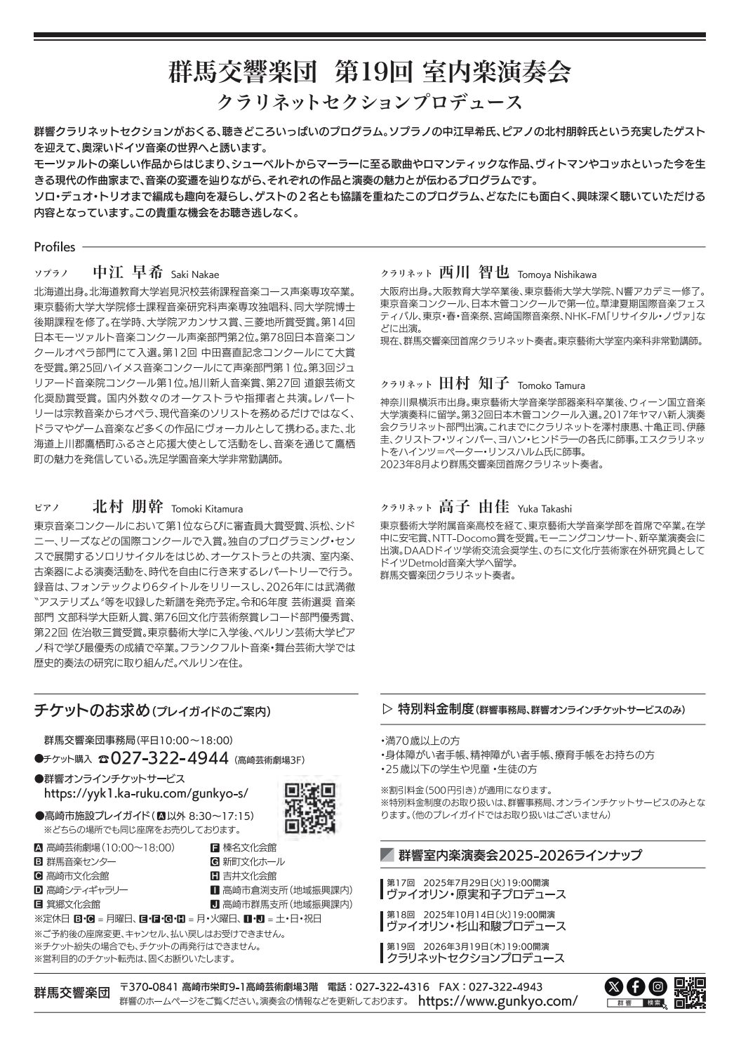 特別料金制度の取り扱いは群響事務局扱いのみ(他のプレイガイドでは適用されません)
